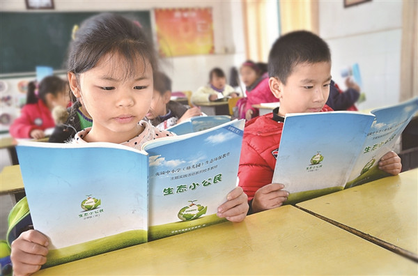 夷陵区鸦鹊岭镇红土小学二(1)班学生在阅读《生态小环保》教材。为培育生态文化理念、掌握生态技能和养成生态习惯,夷陵区教育部门编写了中小学以生态环保教育主题实践活动系列校本教材《生态小公民》和《从小爱环保》,免费发放给全区中小学生和幼儿循环使用。该教材分幼儿版、小学低高年级版;初中版共四册,每册12个环保主题。 通讯员 易正权 摄