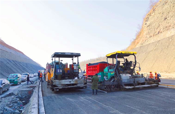 12月19日,沥青摊铺机在宜(昌)黄(花)公路黄花段进行刷黑作业。全长8.24公里的宜黄一级公路设计时速80公里,双向四车道和六车道,将于2018年元旦具备通车条件。记者 黄余洋 摄