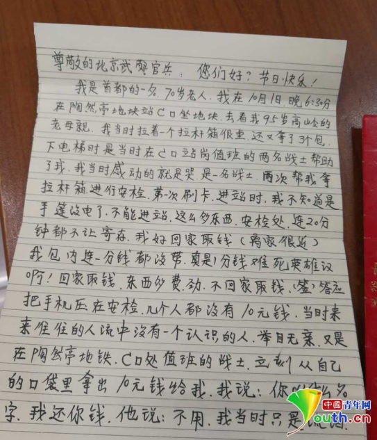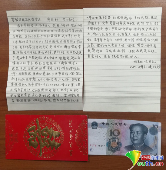 中国青年网北京10月3日电 (记者 陈琛 通讯员 姜润邈)国庆假期第二天,一位70岁老人冒雨来到北京地铁陶然亭站。她不是来搭乘地铁,而是来送“红包”。红包里装着一张10元纸币和一封信。