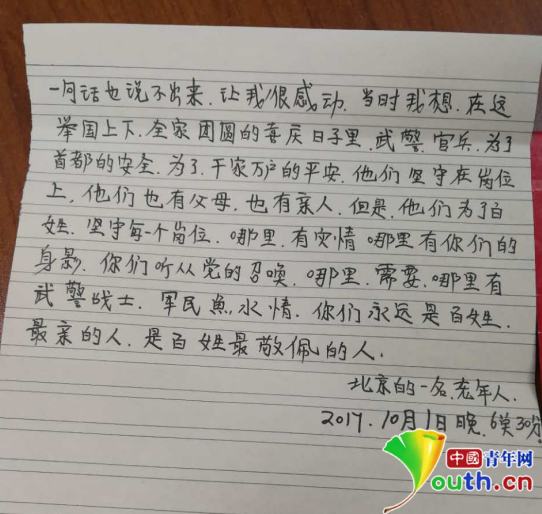 老人在信里说:“当时我想,在这举国上下、全家团圆的喜庆日子里,武警官兵为了首都的安全,为了千家万户的平安,他们坚守在岗位上。他们也有父母,也有亲人,但是,他们为了百姓,坚守每一个岗位。哪里有灾情,哪里有你们的身影。你们听从党的召唤,哪里需要,哪里有武警战士。军民鱼水情,你们永远是百姓最亲的人、是百姓最敬佩的人。”