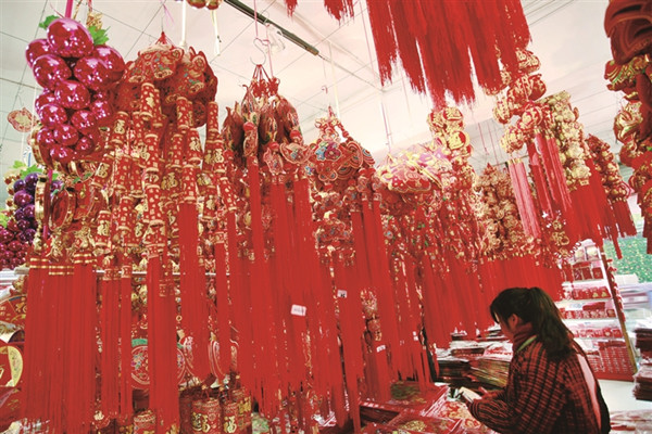 ①1月1日,宜昌城区港窑路一家集贸市场里,红红火火的年画、春联、灯笼、福字等传统文化年货准备充足,供需两旺,节日市场一派喜庆。 记者 黄翔 摄