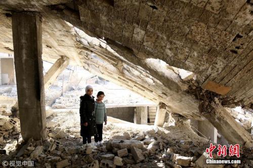 资料图:叙利亚大马士革东古塔区,一对小姐妹站在满目疮痍的家园上。